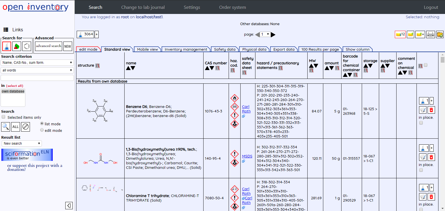 It is operated in the web browser (Edge, Firefox, Opera, Apple Safari, Google Chrome) and is therefore platform-independent. The integration means that physical data and safety information from the inventory can be used automatically in the laboratory journal. The automatic query of freely accessible substance data from online chemical catalogs saves manual data entry and catalog searches. Access to the catalog data also enables a price overview to be created with a click of the mouse.